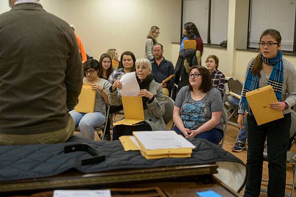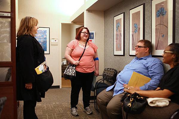 圖片說明 潔西卡 ̇夏皮羅,從左邊數來第二位,照片中的她正與跟凱斯 ̇奧爾斯科維克說話,在他們兩人的醫師辦公室中。拍攝時間是他們手術前的一個月。